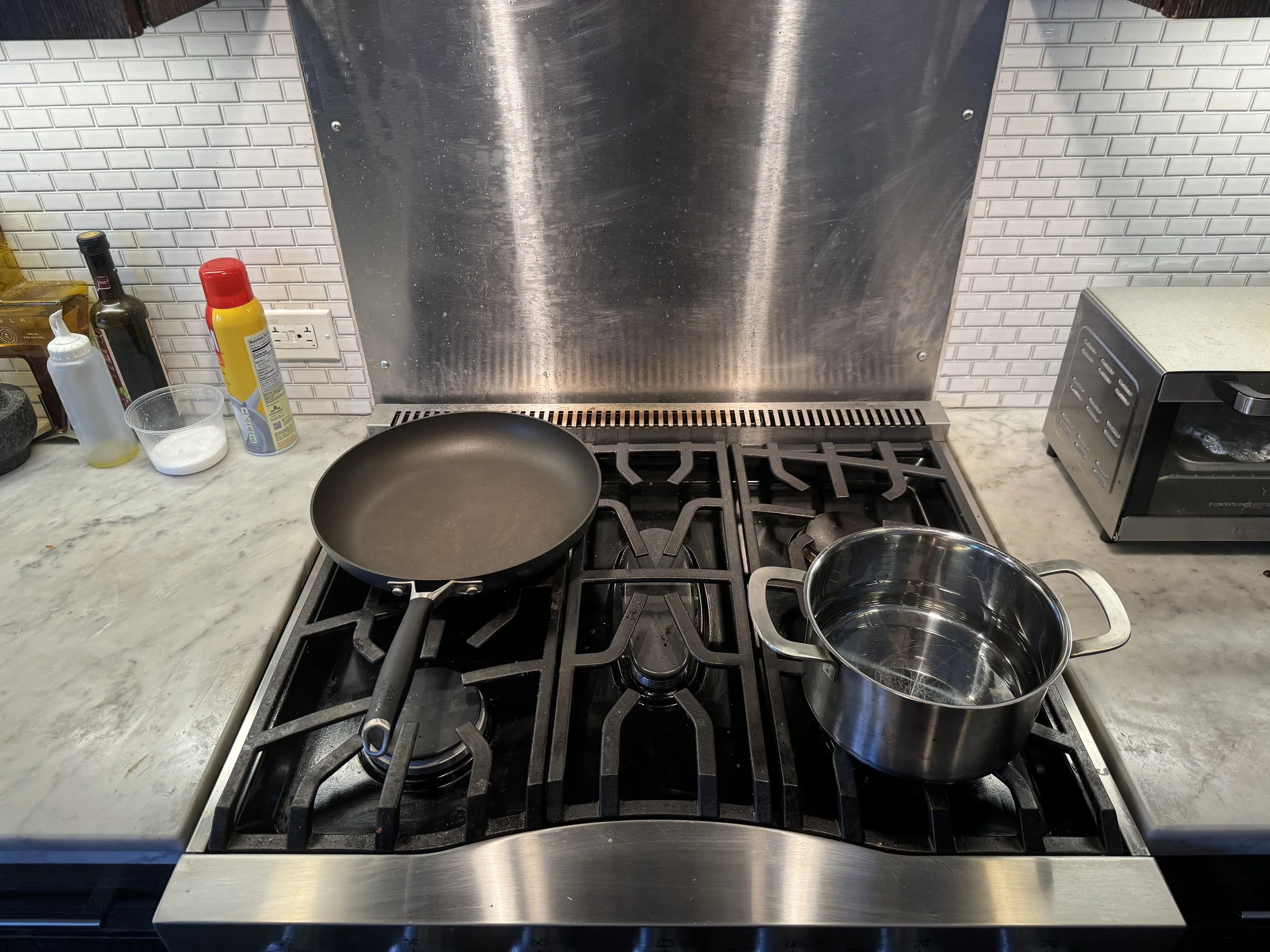 Step 1: start boiling 2 quarts of water with a generous pinch of salt. The next steps of the recipe can take place in a separate saute pan in parallel in order to save time, which is why I have a dual-pot setup