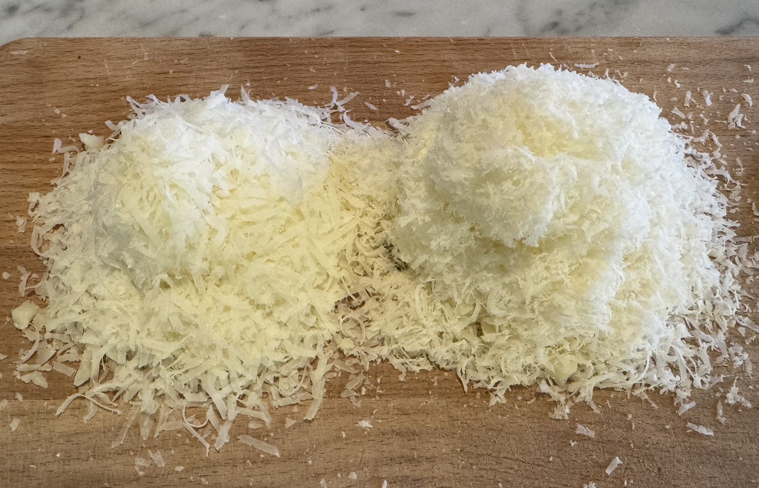 Step 2: grate the pecorino romano and Parmigiano Reggiano cheeses — yum!