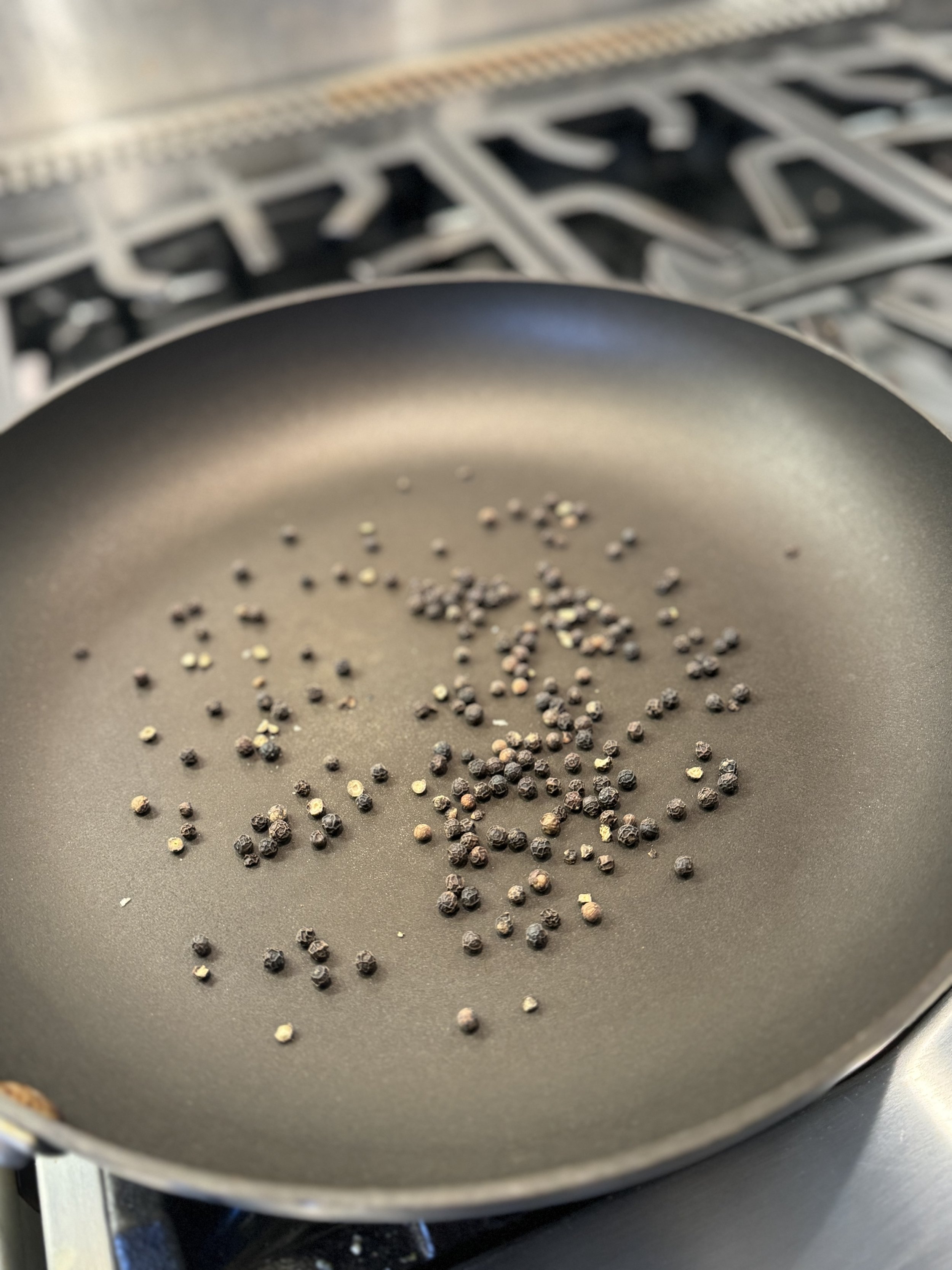 Step 3: cook the whole Telicherry peppercorns on medium heat until fragrant — it will smell roasty!